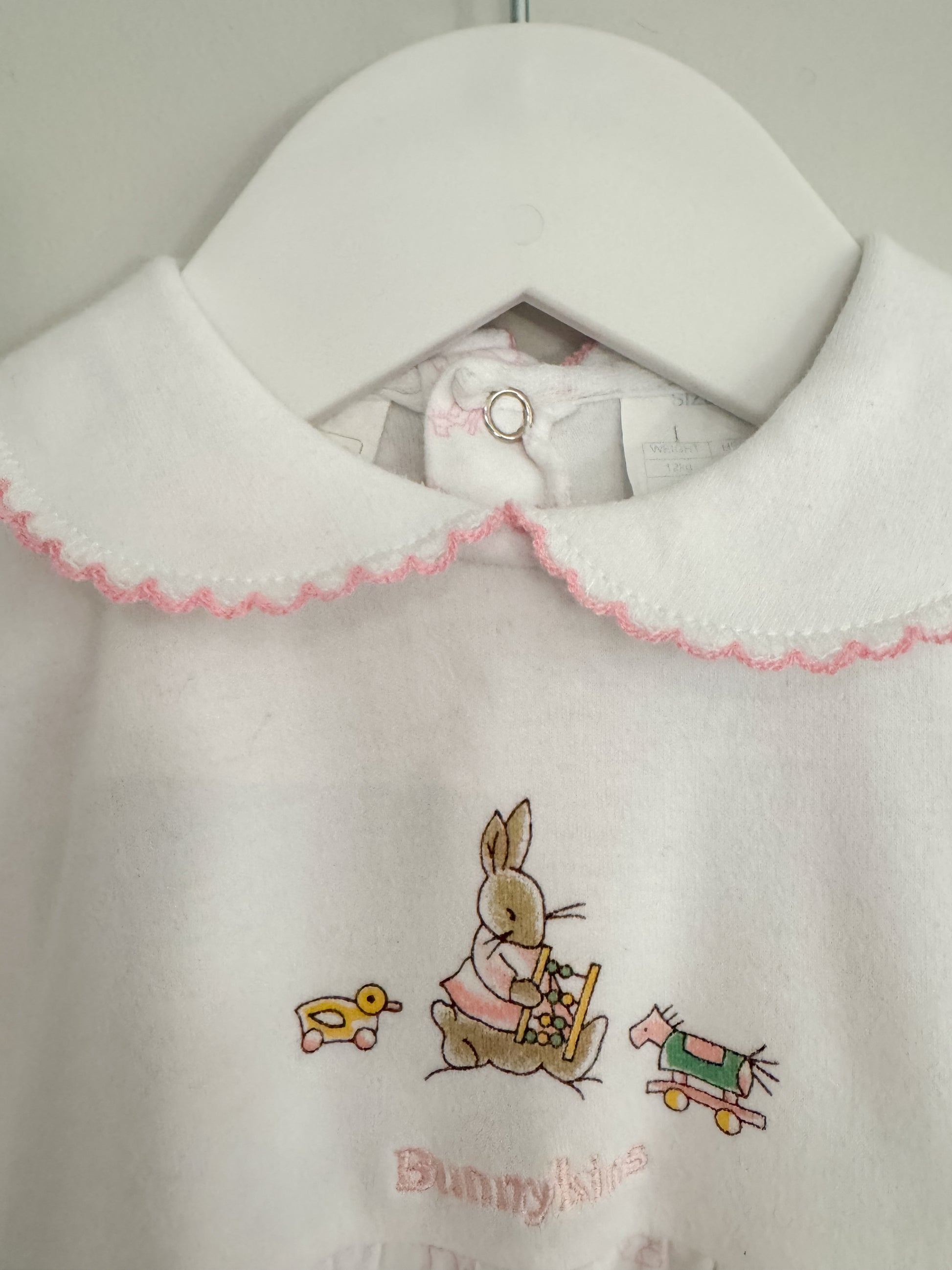 Adorable Bunnykins bubble romper featuring a charming Easter bunny print – perfect for the festive season or a sweet springtime outfit. Soft, lightweight fabric with snap closures for easy changes. Size 1. Excellent condition with no marks or flaws