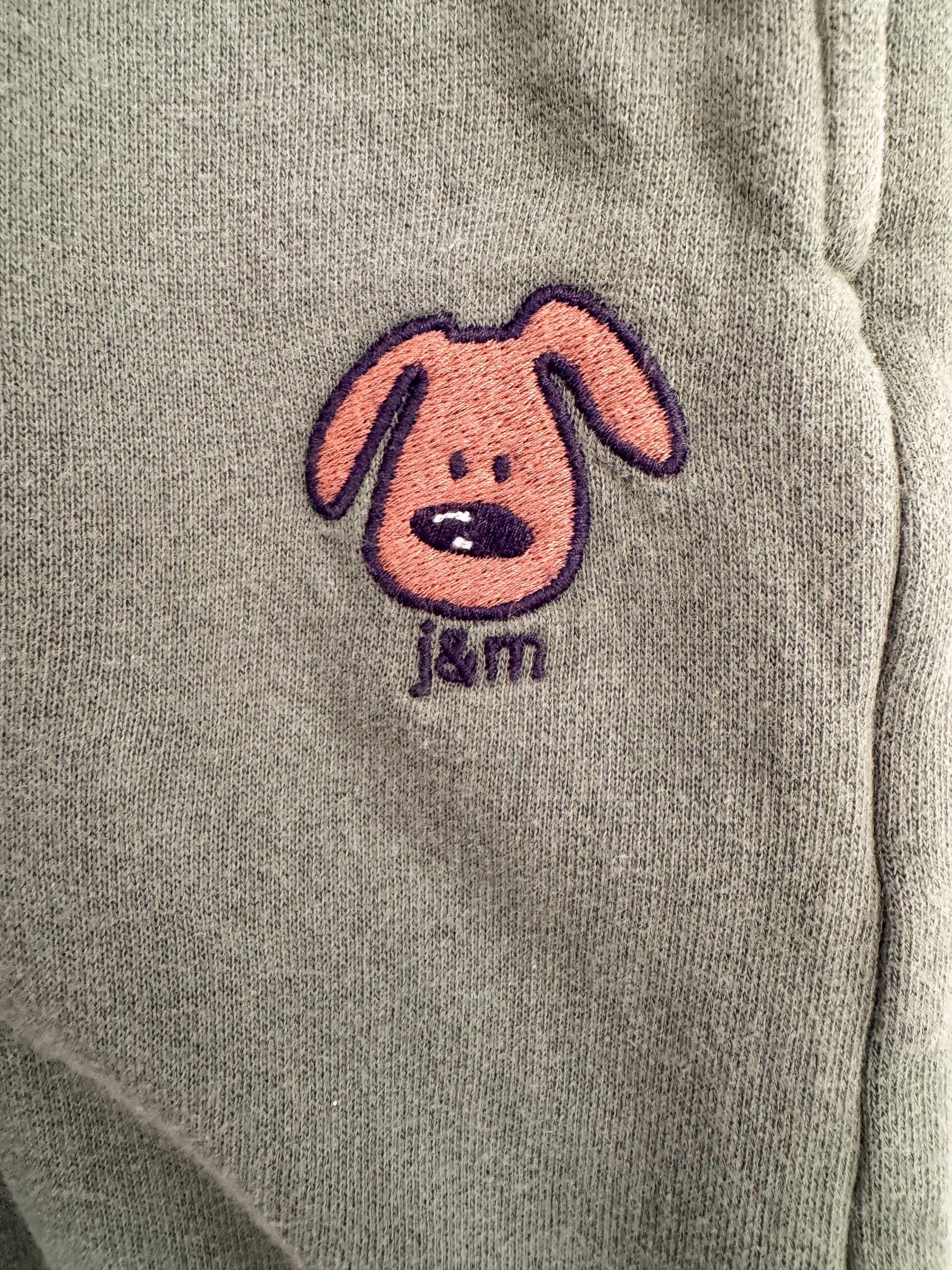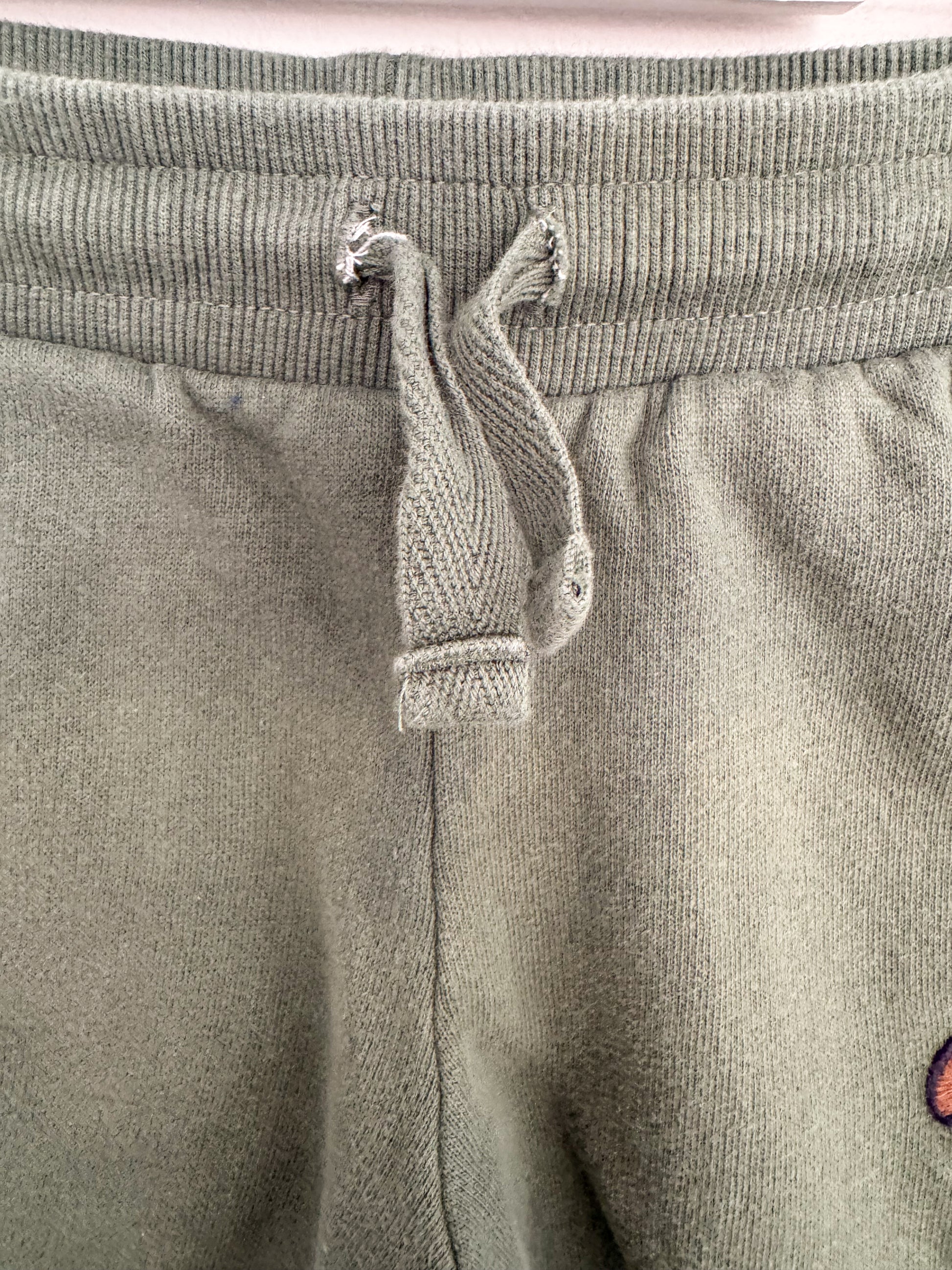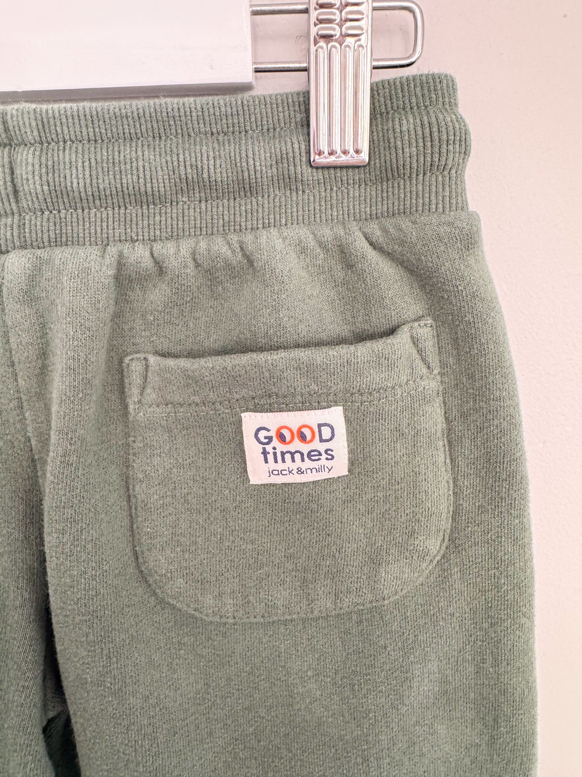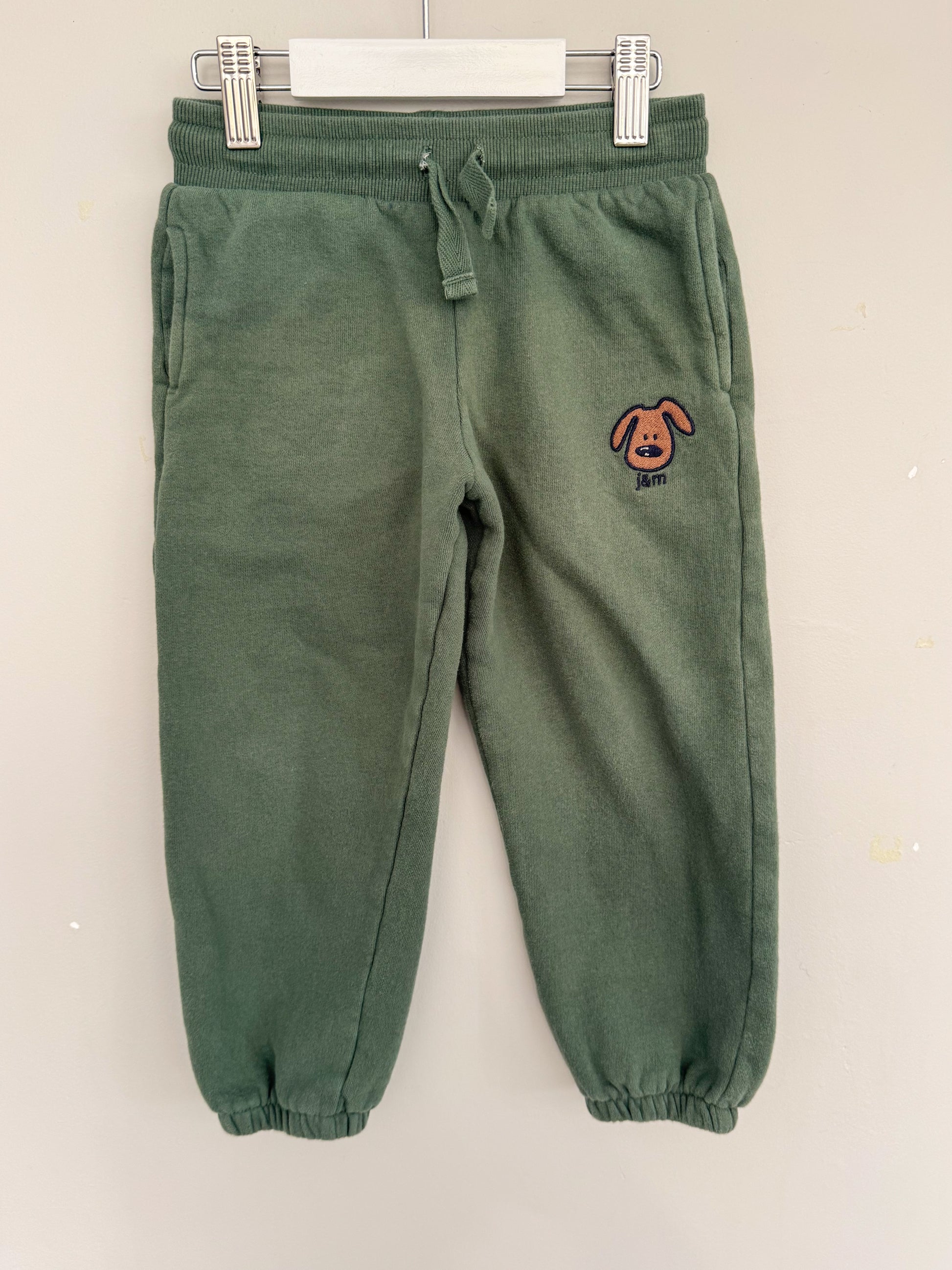 Keep your little one comfy and warm in these soft green track pants from Jack & Milly. Featuring a cute embroidered dog face on the front and a “Good Times” patch on the back pocket, these pants are perfect for play or lounging. They include an elastic waistband with a drawstring for adjustable comfort, and cuffed ankles for a snug fit. Gently worn, in great condition.