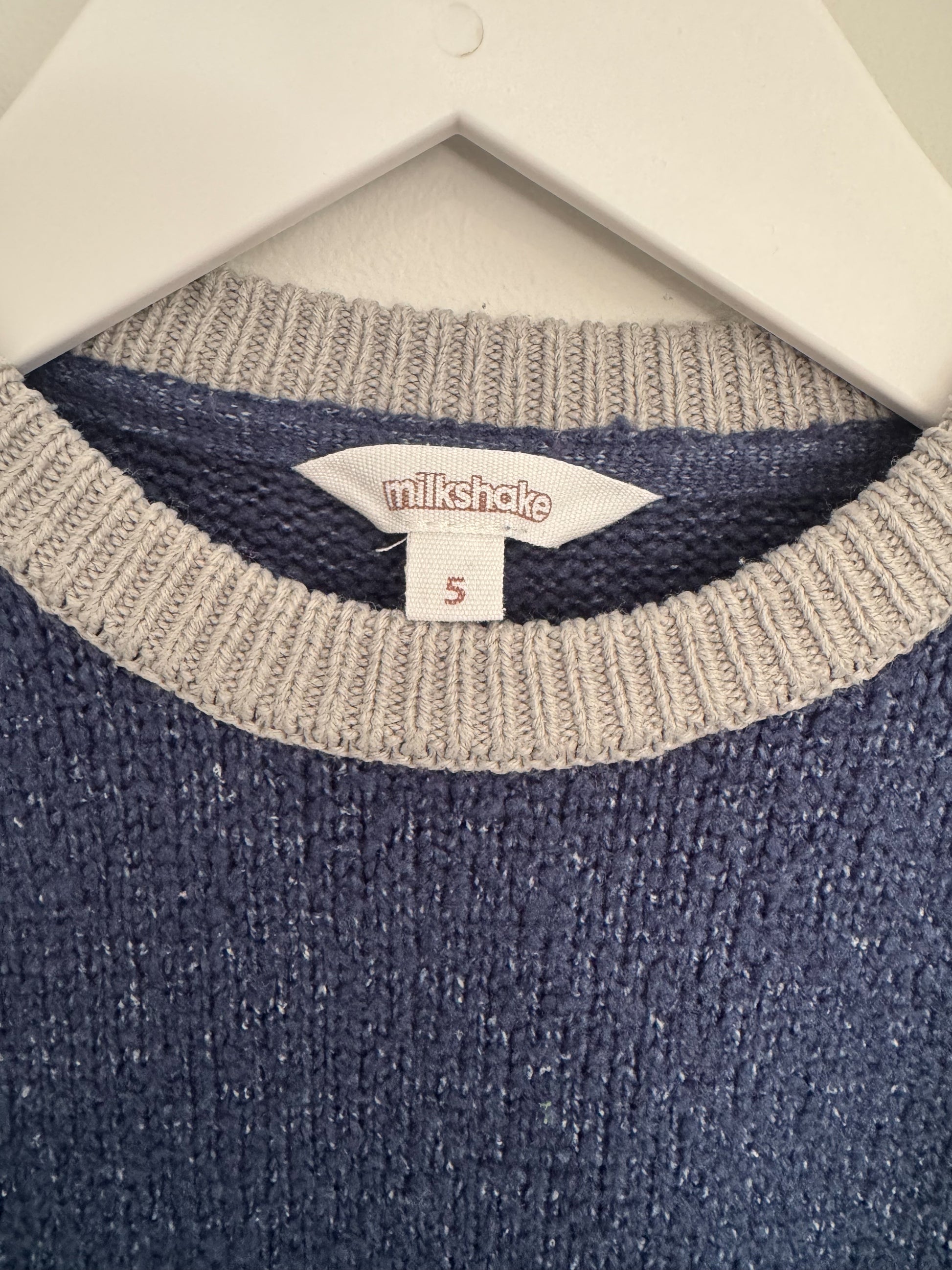 Super cool navy knit jumper from Milkshake featuring a playful green dinosaur design with fun textured details. Soft and cosy with grey ribbed cuffs and hem for a snug fit. Size 5. Excellent condition – no marks or signs of wear.
