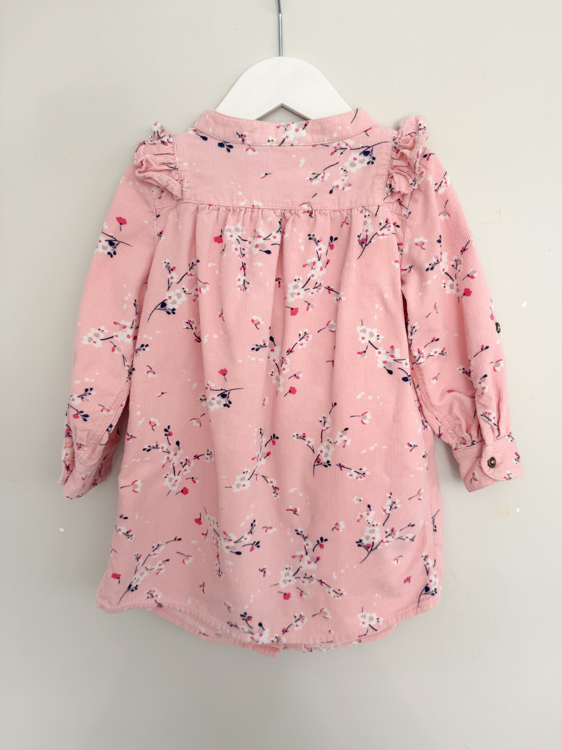 Gorgeous pink corduroy dress by Milkshake featuring a delicate floral print and ruffle detail across the chest and shoulders. Button-up front for easy dressing. Size 3.