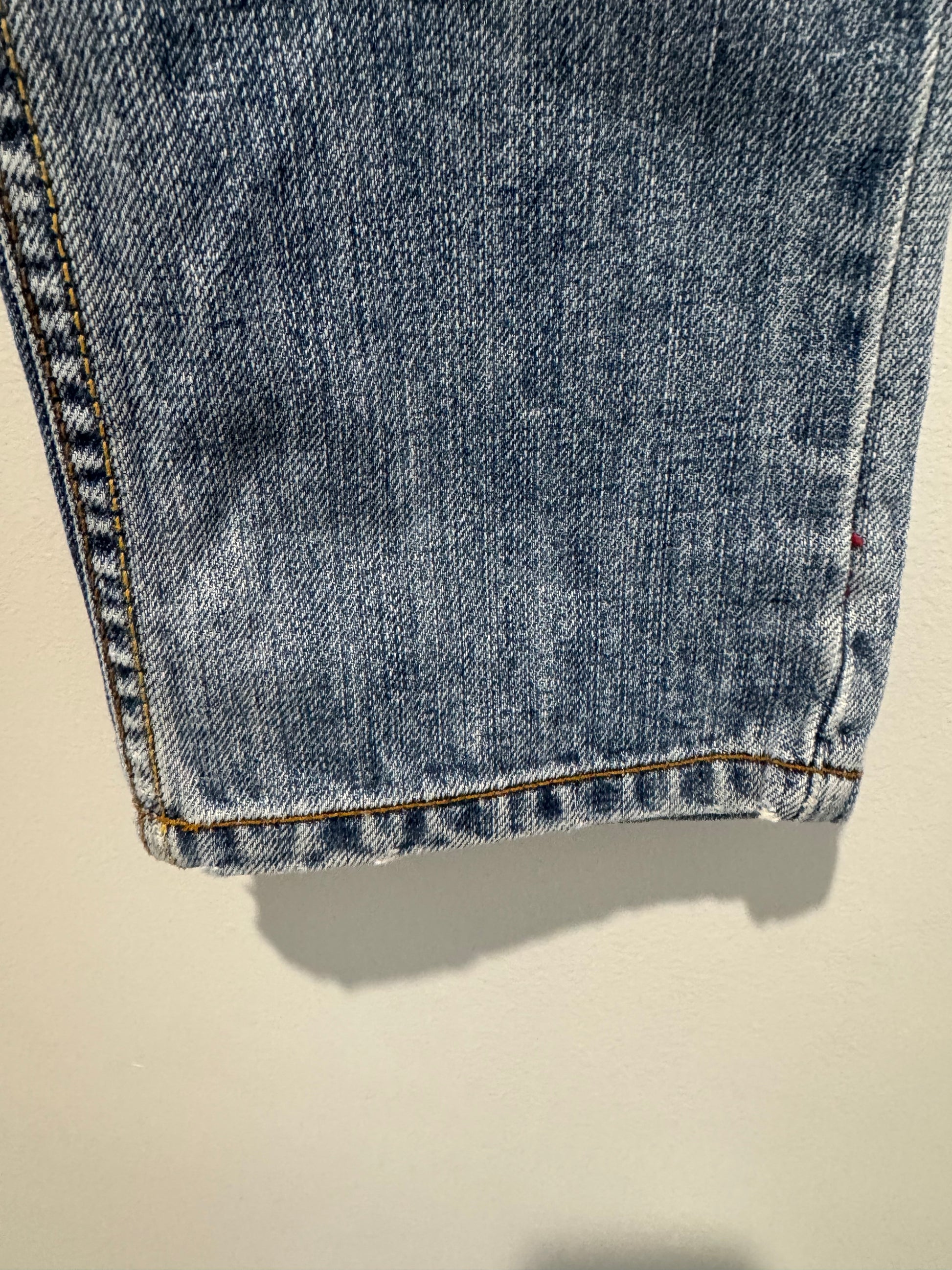 Classic meets cool in these Quiksilver kids’ jeans, perfect for everyday wear. Featuring a light blue wash with signature orange contrast stitching and a straight leg cut, these jeans bring effortless surf-inspired style to your little one’s wardrobe. Distinctive Quiksilver branding is visible on the front coin pocket and rear pocket tab, while the embroidered “X” stitch detail on the back pockets adds a unique touch. Zip fly with snap button closure. Great pre-loved condition with a small faint patch on back of leg (see final photo).