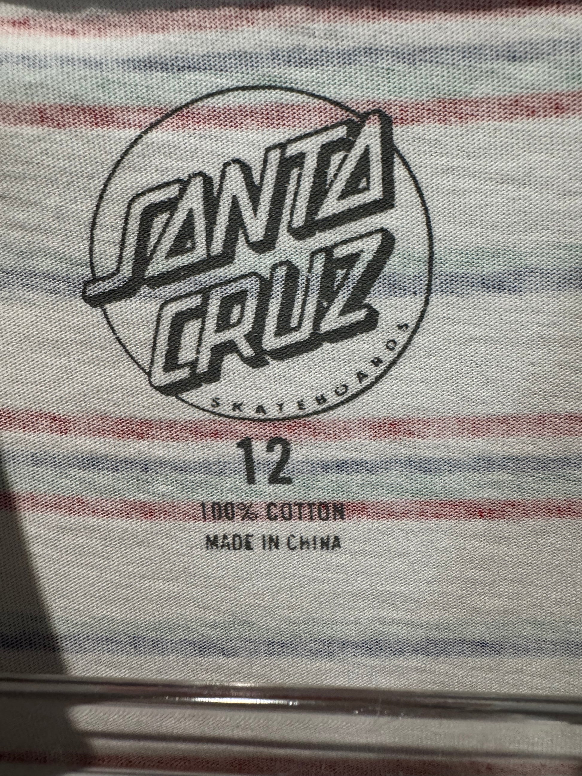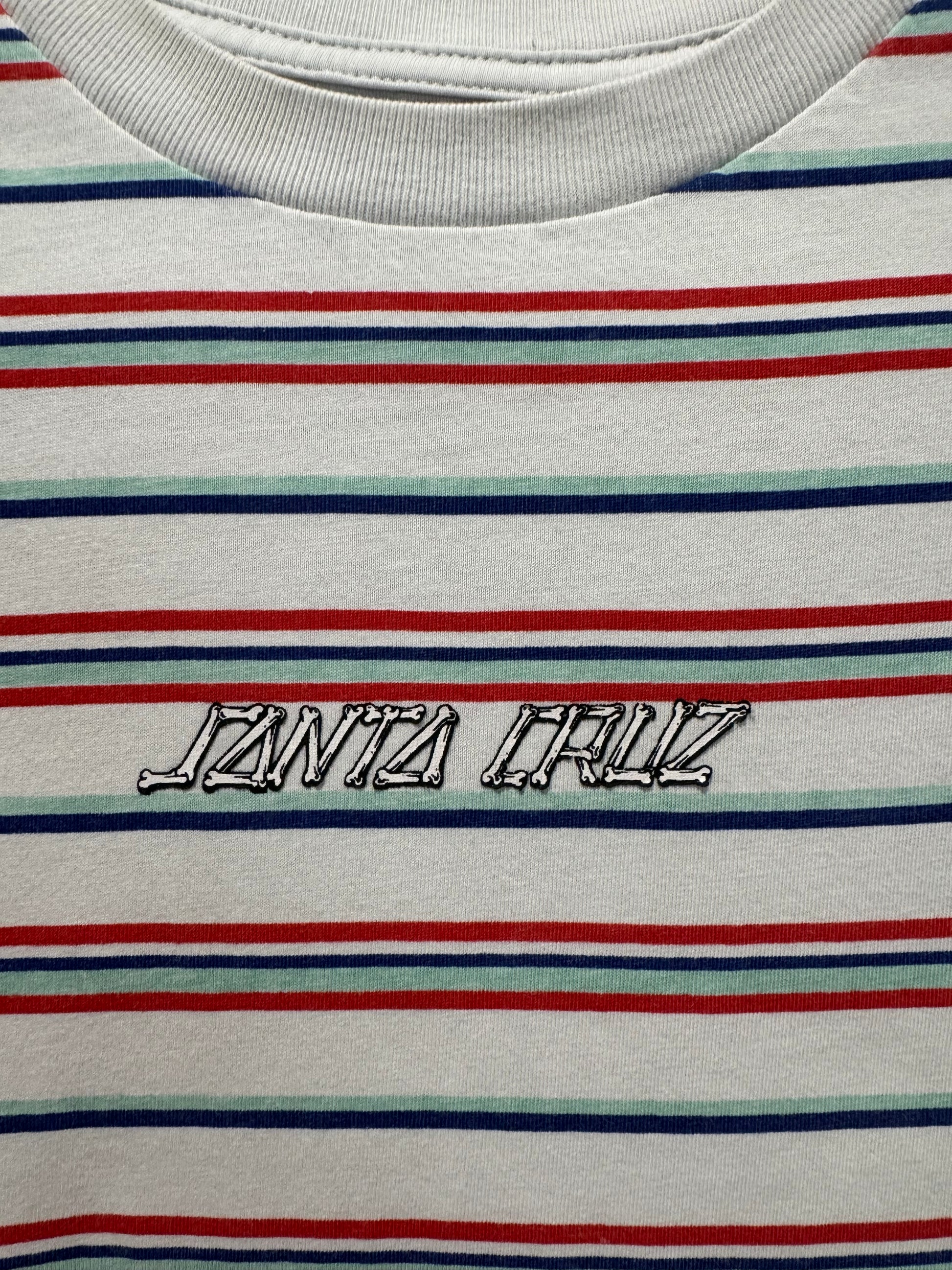 Retro skater vibes in this Santa Cruz striped tee, featuring bold red, navy, and mint stripes across a crisp white base. Finished with printed “Santa Cruz” bone-letter branding at the chest for an edgy twist on a classic look. Made from 100% cotton for a comfy, breathable fit.
